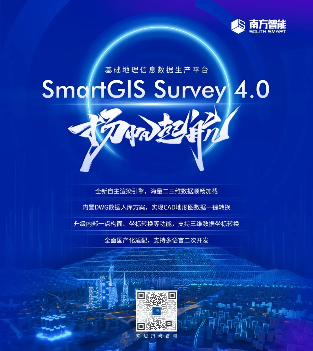 提供全流程、本地化、快速响应的软件技术支持服务。专注于行业生产应用的SmartGIS Survey标准版软件近日已升级至4.0版本,新增点云、新型基础测绘生产、勘测定界等模块,目前提供限时免费试用,欢迎各位扫描下方二维码咨询详情。