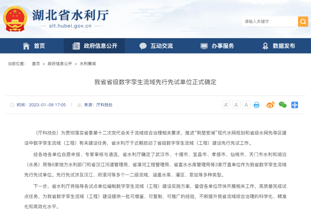 2023年初,为推进“荆楚安澜”现代水网规划和省级水网先导区建设中数字孪生流域有关建设任务,湖北省水利厅启动了省级数字孪生流域建设先行先试工作,仙桃市水利和湖泊局等9家单位被遴选为省级数字孪生流域先行先试单位。先行先试工作将通过推进信息技术与水利业务的深度融合,为湖北省数字孪生流域建设提供一批可借鉴、可复制、可推广的经验,不断提升湖北省流域综合治理的科学化、精准化和高效化水平。