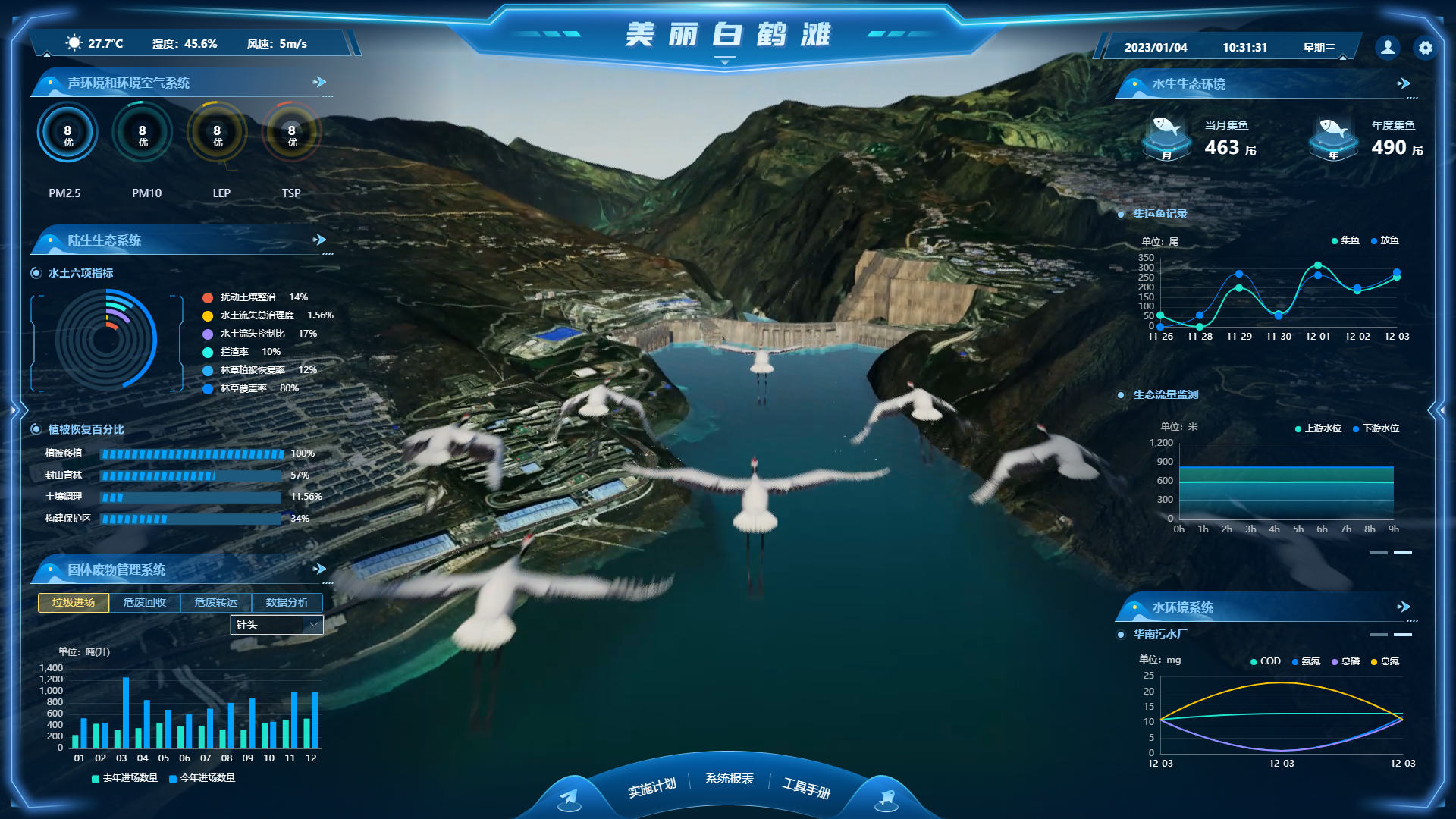 项目通过实时数据接入,在三维场景中直观展示、实时更新半坡营地污水处理厂污水4项指标(按小时)、环境自动监测站4项指标(按小时)、固废场(按日)、集鱼站(按日)、古树保护(视频监控实时画面)及集鱼站提升装置(视频监控实时画面)的数据,提升白鹤滩库区环保数据监测的及时性和有效性。