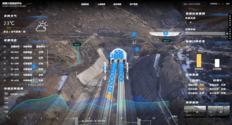 基于数字孪生技术,实现工务、电务、供电三大专业20余种设备的可视化呈现,融合铁路运营信号和自然灾害监测预警信息,还原铁路数字化运营场景,为铁路三维仿真、业务培训、灾害监测、设备管理、资产运营等需求提供数字底座服务。