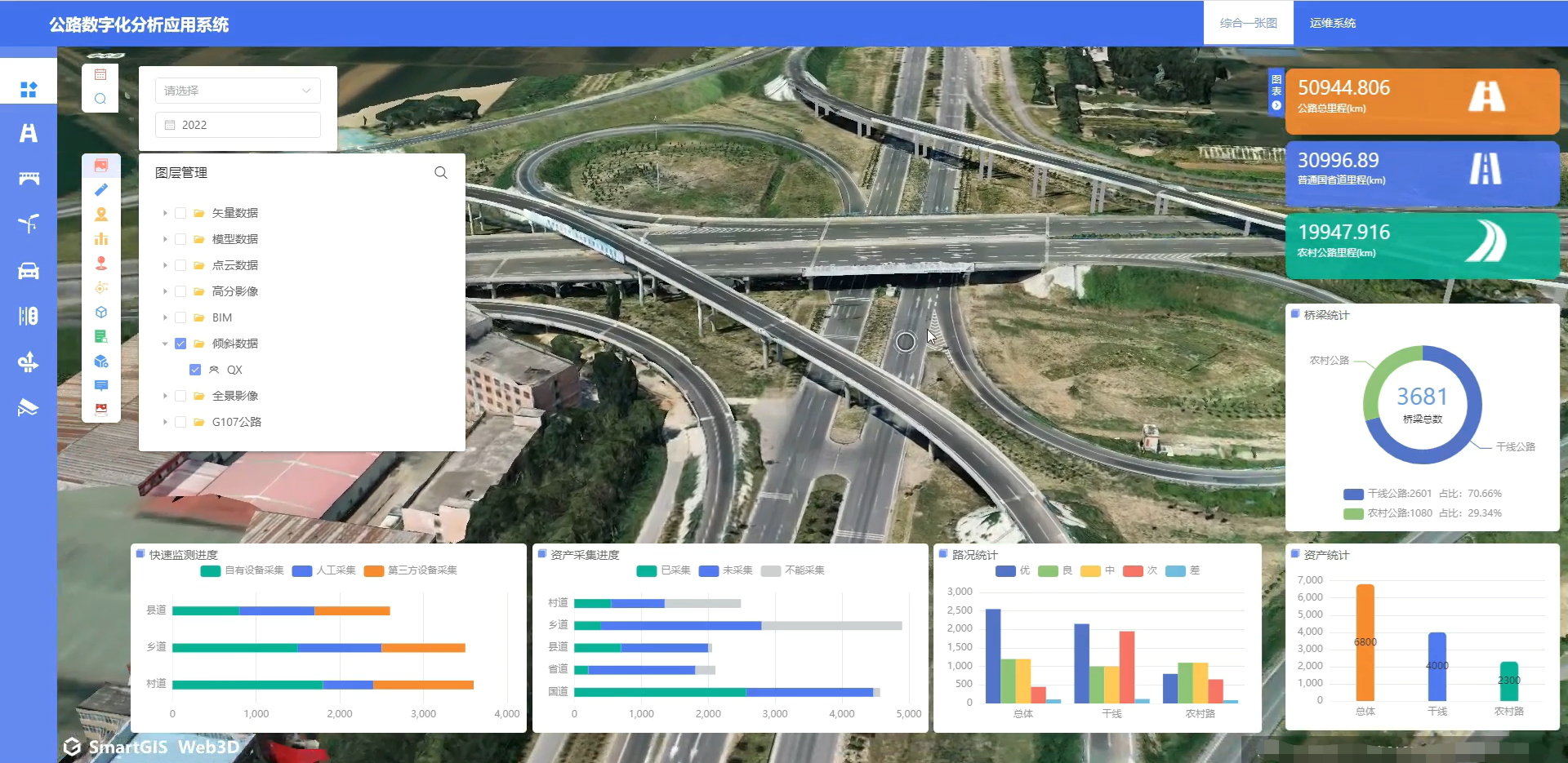 基于数字孪生技术,以路网、路资、信号标识为要素构建数字孪生可视化场景,实现路、桥、隧数字孪生资产覆盖率100%,服务公路建设、运营和处置的全生命周期管理,满足智慧公路的资产管理数字化、建管养运一体化、监测预警精细化、决策指挥智能化、公路服务多元化等要求。