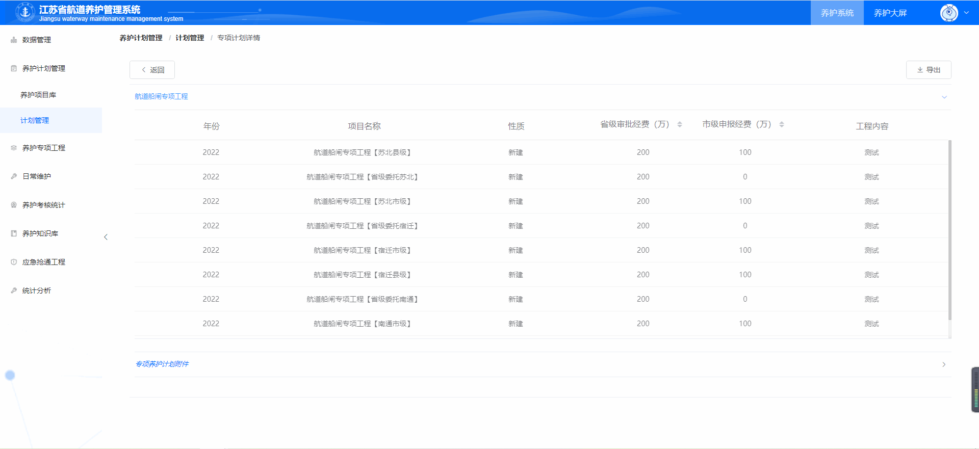 以海量高精度数据资源体系和航道养护管理业务为基础,实现航道养护的养护计划管理数字化、养护项目流转规范化、养护巡航维护移动化、业务节点统计可视化、绩效考核统计电子化,建成一个统一高效、科学合理、数据共享、持续更新的信息化航道养护管理平台。