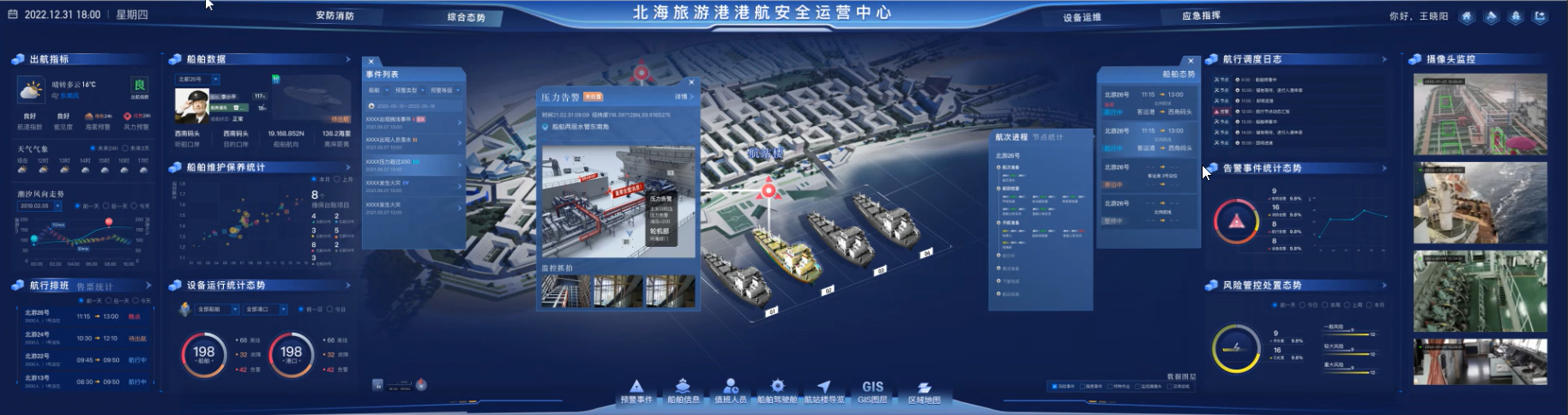 以数字孪生技术为核心,对旅游港口的商业街、航站楼、码头、游船、航线、水下地形进行高精度3D建模,通过对不同事件的模拟仿真和实时监测,深度服务船舶航前检查、航行安全监测、船舶靠泊监管、船舶机务安全、港口特种作业监管、港口隐患排查、港口风险管控等业务场景,动态呈现当前航线、港口的安全态势和风险等级,为港口运营部门提供安全辅助决策、隐患过程管控、风险及时预警、事故应急指挥、日常运营等核心功能。