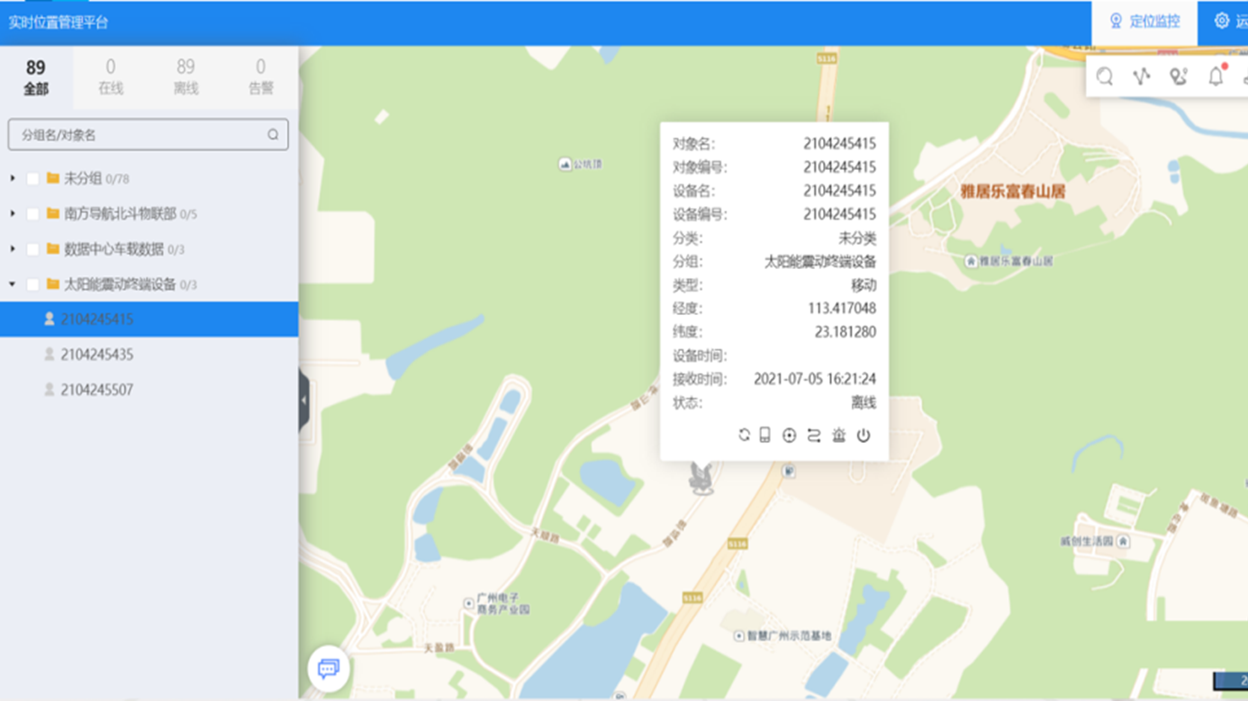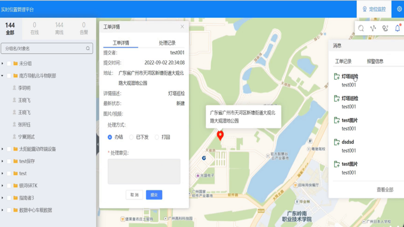 定位监控功能主要实现对车辆和人员进行定位和监控。在巡检区域地图上将车辆及巡检员携带的终端设备回传的信息进行显示,可以实时定位和监控所有车辆和巡检员的位置,也可以按时间段查询巡检员的巡检轨迹。