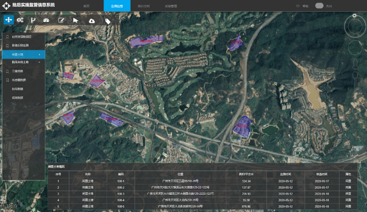 批后实施监管系统是对批而未供建设用地、低效用地、闲置土地等图斑的面积、分布情况进行实时监测,根据监测统计数据分析出批而未供、低效用地、闲置土地的空间分布特征、变化趋势及成因,为科学用地管地提供重要依据。