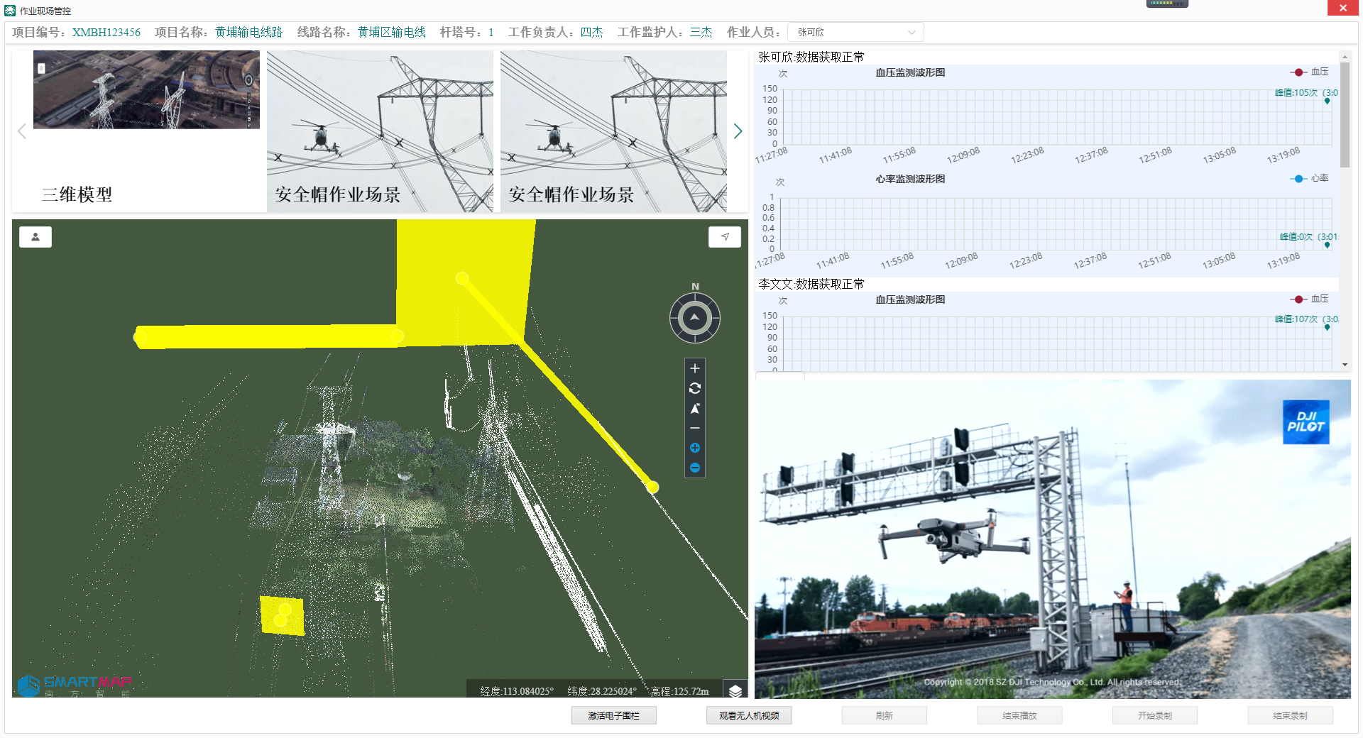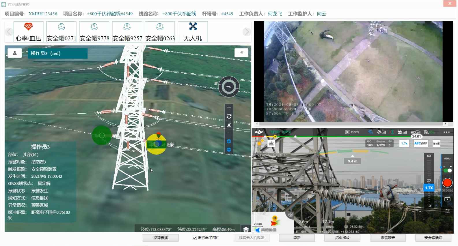 研制作业过程高空监控无人机与智能安全帽,作业现场监控无人机悬停全程摄像,智能安全帽拍摄、回传带电作业人员第一视角摄像画面,视频数据可回传至地面管控端及远程指挥中心。