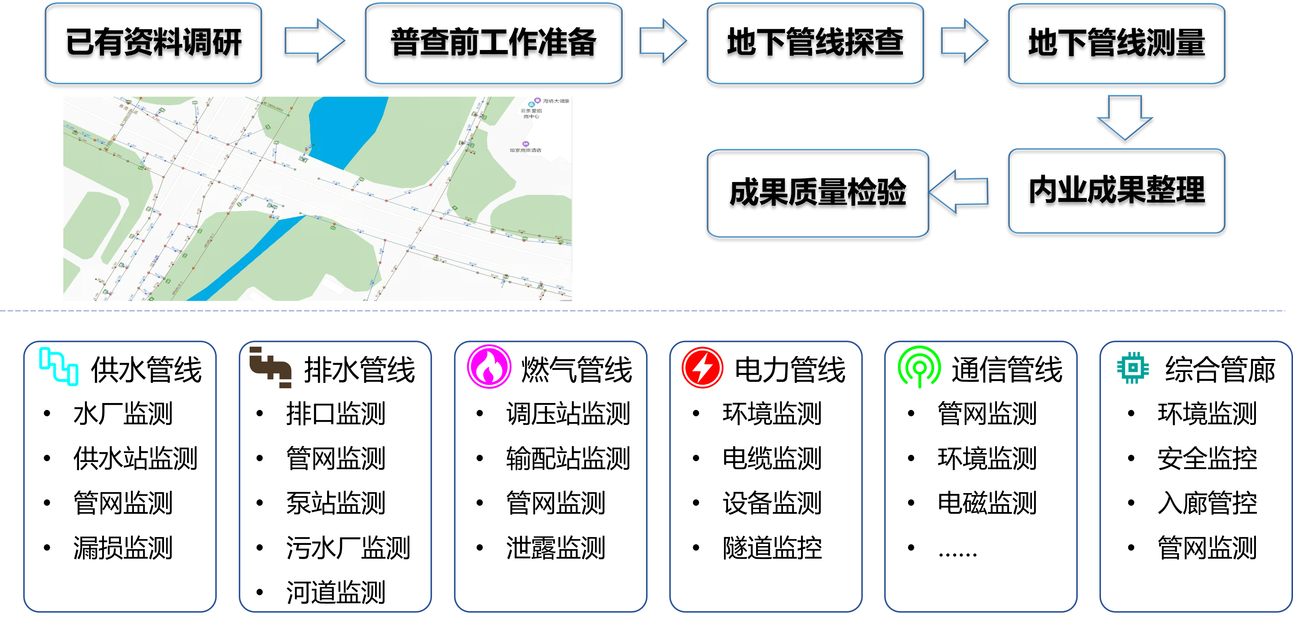 根据最新国家标准和规范,开展管网管廊普查、监测设备敷设工程,全面摸清管网管廊家底,实时掌握管网管廊运行状态,为城市管网管廊的日常养护与应急处置等工作提供实时、科学、可靠的数据支持。