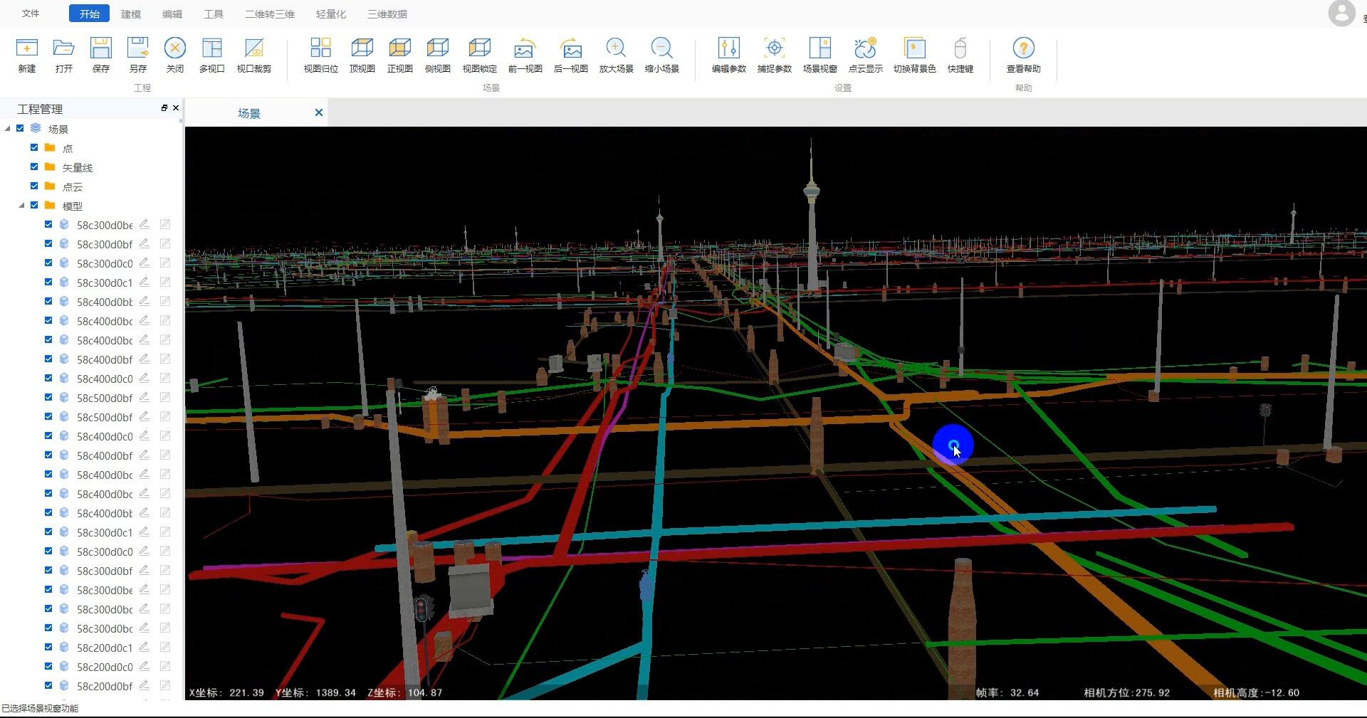 以二维管网管廊成果数据为基础,提供三维模型构建、模型管理、纹理定义、坐标转换、数据质检、格式转换、成果预览及导出等功能,实现三维管网管廊模型数据的快速构建,建模效率高,模型成果格式通用。
