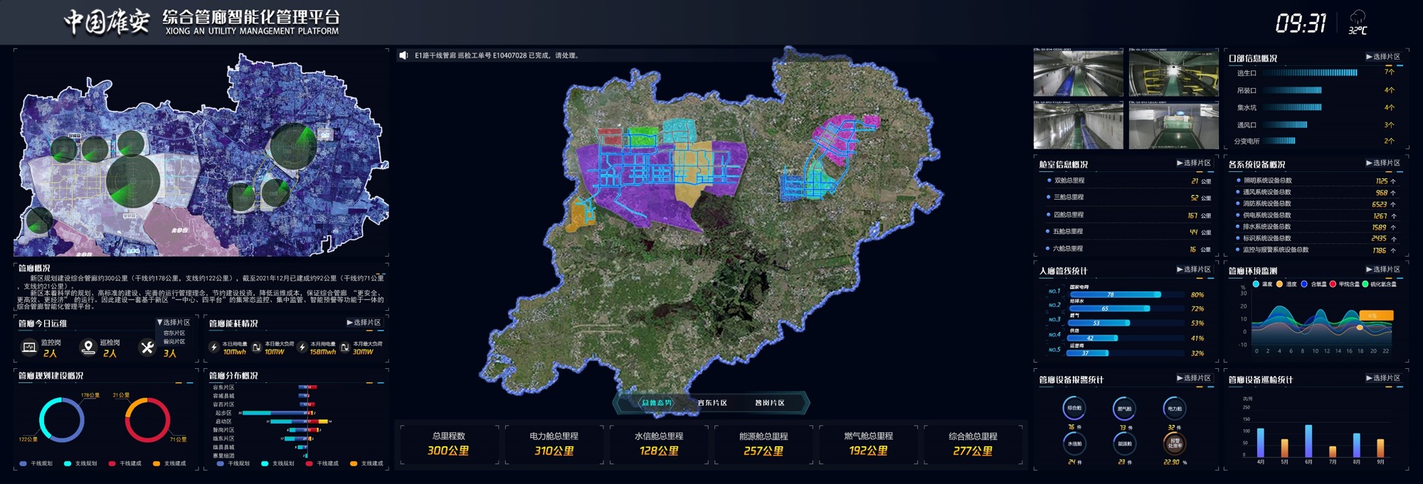 借助大数据、人工智能、物联网、云计算等技术,基于雄安新区“一中心、四平台”构建集常态监控、异常报警、集中监管、智能预警等功能于一体的中国雄安综合管廊智能化管理平台,为容东片区、昝岗片区约32公里管廊工程提供全生命周期服务。